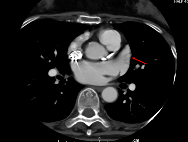 図:実際の術前左房造影 3D・赤矢印 左心耳にて血栓が無いことが確認できます。