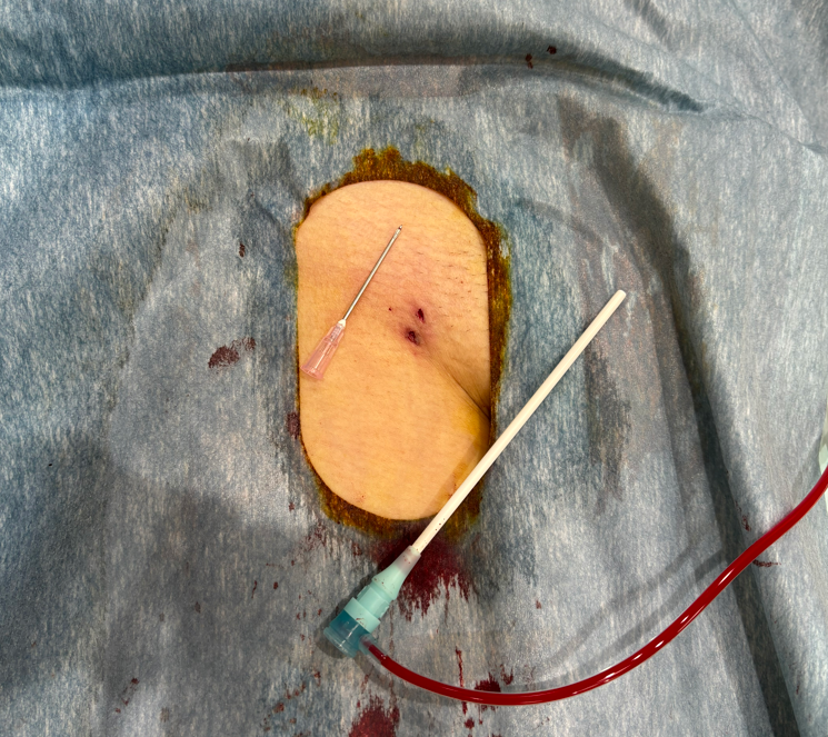 デバイスの進歩にて穿刺本数や手術時間は削減されており、最もシンプルな症例では穿刺は右鼠経2本のみ、手術時間は穿刺から抜去までで1時間弱となります。