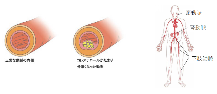 足や頭・腎臓などに血液を送る末梢動脈が狭くなり、血液が流れにくくなる病気です。