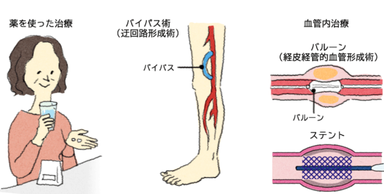 大きく分けて、薬物療法、運動療法(リハビリ)、血管内治療・手術があります。