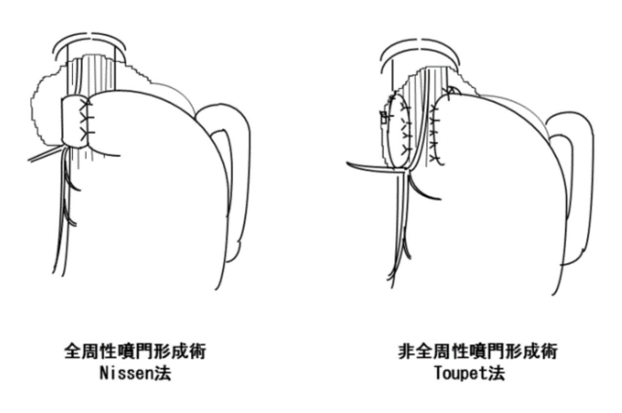 手術は腹腔鏡手術です。お腹の皮膚を4-5ヶ所、5-10mm程度小切開し、そこから内視鏡や細い手術器具を入れて行います。多くの患者さんが、食道裂孔ヘルニアを合併しているため、まずは胸の中にずれ上がった胃をお腹の中に戻し、次にゆるんだ食道裂孔を縫い縮め、最後に胃の一部を食道に巻きつけて壊れた逆流防止機構を修復します。