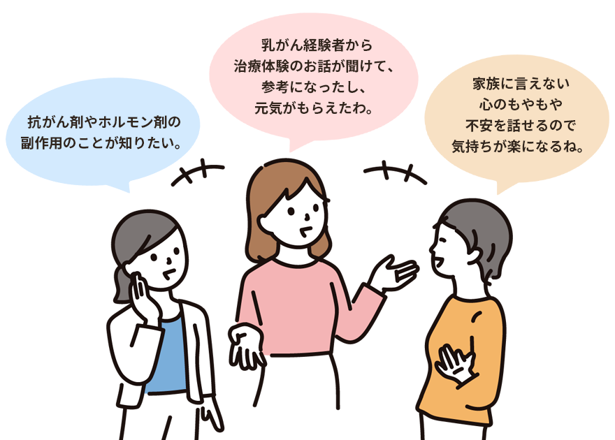 おしゃべり会では、治療による副作用の悩みや闘病生活の中で生じるさまざまな悩みなど、何でも自由に話し合っています。同じ経験を持つ患者同士だからこそ、つらさや悩みを理解でき、分かち合っています。