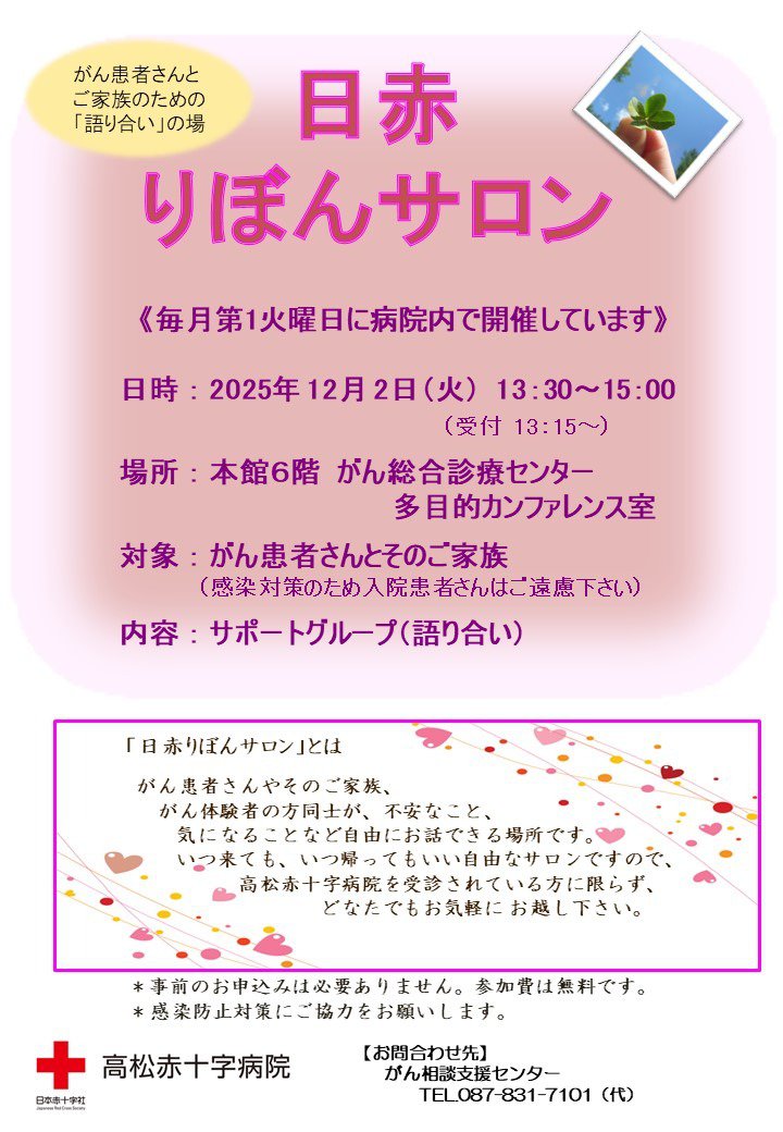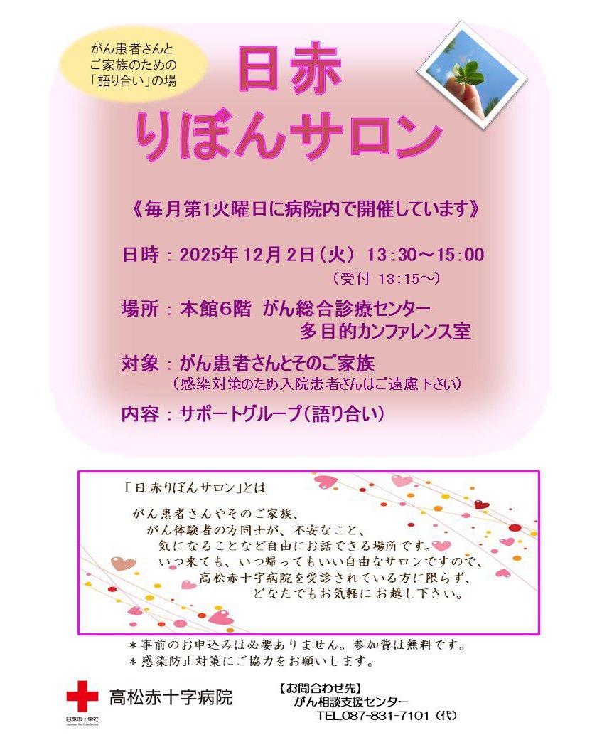 がん患者さんとその家族 (感染対策のため入院患者さんはご遠慮ください) (高松赤十字病院を受診されている方に限らず、どなたでもお気軽にお越しください) |