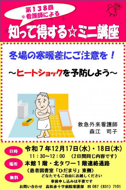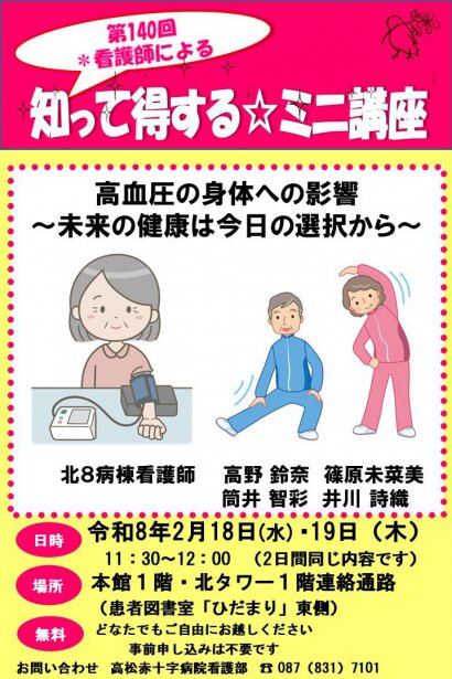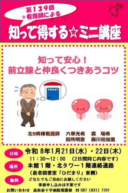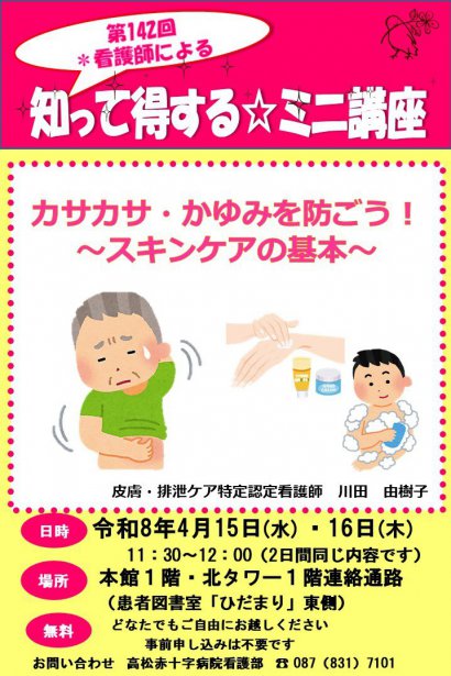 高松赤十字病院看護部では「病院に入院する」患者さんに提供する看護だけでなく、「地域で暮らす」みなさんにも私たちの看護を提供したいという思いから毎月「看護師による知って得する☆ミニ講座」を開催しています。この講座では「地域で暮らす」みなさんを対象に、当院の看護師が健康増進や、疾病予防、病気や治療についてわかりやすくお話します。