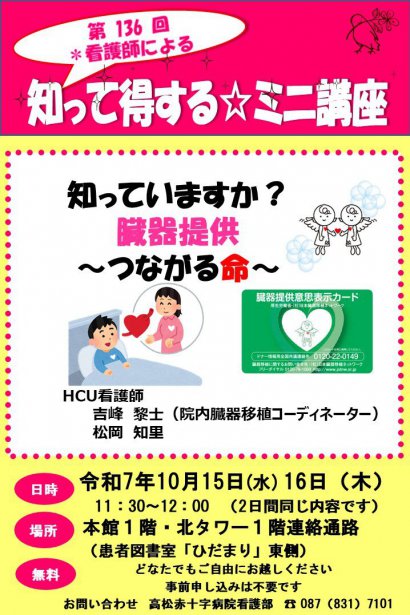 高松赤十字病院看護部では「病院に入院する」患者さんに提供する看護だけでなく、「地域で暮らす」みなさんにも私たちの看護を提供したいという思いから毎月「看護師による知って得する☆ミニ講座」を開催しています。この講座では「地域で暮らす」みなさんを対象に、当院の看護師が健康増進や、疾病予防、病気や治療についてわかりやすくお話します。