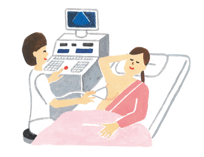 乳腺エコー検査は、超音波診断装置を使って乳腺に超音波をあて、はね返ってくる反射波を画像化します。検査では、機器と皮膚の間の空気を排除して滑りをよくするエコーゼリーを塗り、背中にタオルを入れ、両腕を上げて胸を平らにした状態で走査します。