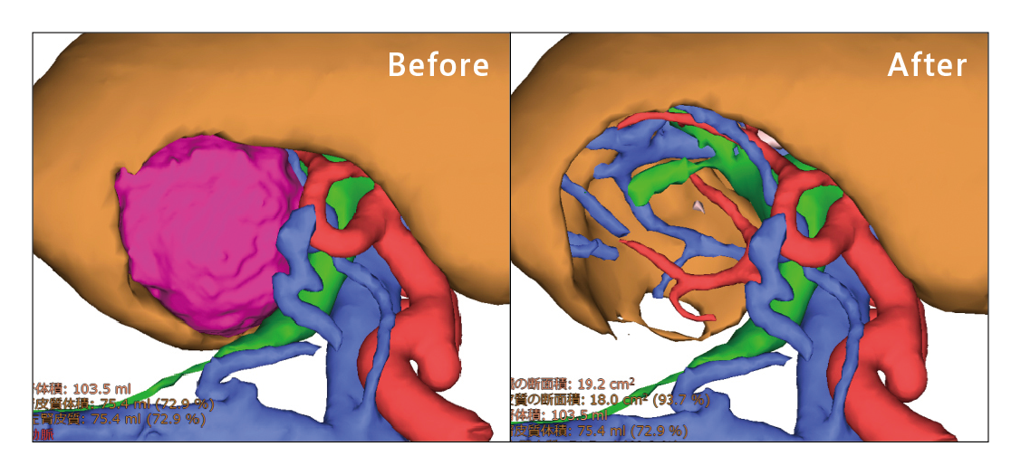 以前は全摘が主流でしたが、近年は腎機能が残るほど生存率も高くなることがわかっています。手術前に「どの血管を切ると、どの範囲の血流が止まるか」を3D画像でシミュレーションし、切除部分をなるべく少なくする・重要な血管を切らずに残す・手術中に血流を止めることによる影響を少なくする、といった「腎機能をできるだけ残す」方法を細かく検討。そのデータをダヴィンチと連携することで、より負担の少ない手術を実現しています。