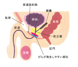 前立腺は精液の成分である「前立腺液」をつくる男性特有の臓器。膀胱の出口付近で尿道と直腸に接しています。前立腺の細胞が増殖して悪性腫瘍化したものが前立腺がんで、早期のうちは自覚症状が少なく、進行とともに「尿が出にくい」「排尿回数が多い」といった排尿症状や血尿・排尿痛・骨への転移などがみられるようになります。