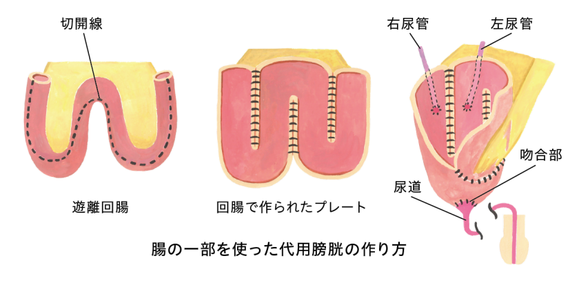 代用膀胱の場合は、外付けのパウチは必要ありません。中でも代用膀胱を自分の尿管につなぐ「自排尿型代用膀胱」は、それまでと同じように自然な排尿ができ、自分らしい生活を守りやすい方法。当院でも膀胱を全摘した患者さんの約半数が代用膀胱を選択しています。