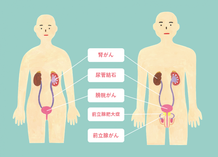 骨盤内の袋状の臓器。腎臓で作られた尿が一定量溜まったら、尿道を通じて体外に排出します。膀胱がんには「尿路上皮がん」「扁平上皮がん」「腺がん」などがありますが、多くは膀胱内部の尿路上皮にできる「尿路上皮がん」。60代以降に多く、男性患者が女性の4倍に上ります。再発しやすいのが特徴で、早期発見で治療した場合でも5年以内に3割程度は再発リスクがあるとされます。