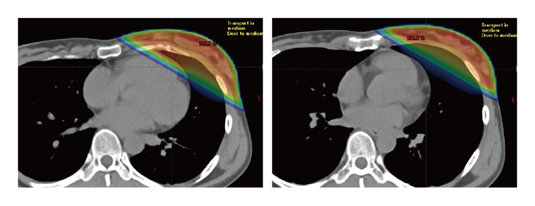 高精度放射線治療では、照射位置を正確に決める必要があります。このため、毎回の治療時に画像を撮影して位置を正確に合わせ込む「画像誘導放射線治療」を行います。また、呼吸で動く部位には、所定の位置に患部が収まる時だけ照射する「呼吸同期照射」により精巧な治療を実現しています。左乳がんの術後照射では、深吸気息止め(DIBH)により心臓への照射を避けることができます。
