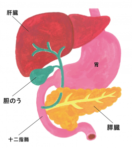 胃の後ろに位置し、「食べ物を消化する膵液をつくる」「血糖値を調節するインスリンなどのホルモンをつくる」という分泌機能を担う。膵臓をすべて失うと栄養消化と血糖値のコントロールも失われるため、薬やインスリン注射による補助が必要